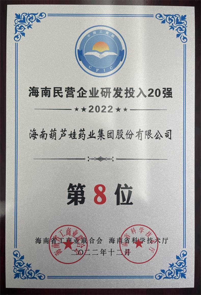 12月23日,2022海南民营企业50强和研发投入20强发布会在海口举行。会上发布了“2022海南民营企业50强”“2022海南民营企业研发投入20强”榜单和分析报告。钱柜QG777药业再次荣登两榜,在海南民营企业50强榜单中位列第25位,较去年上升8位,这也是公司连续三年登榜;在海南民营企业研发投入20强中位列第8位,较去年上升7位。